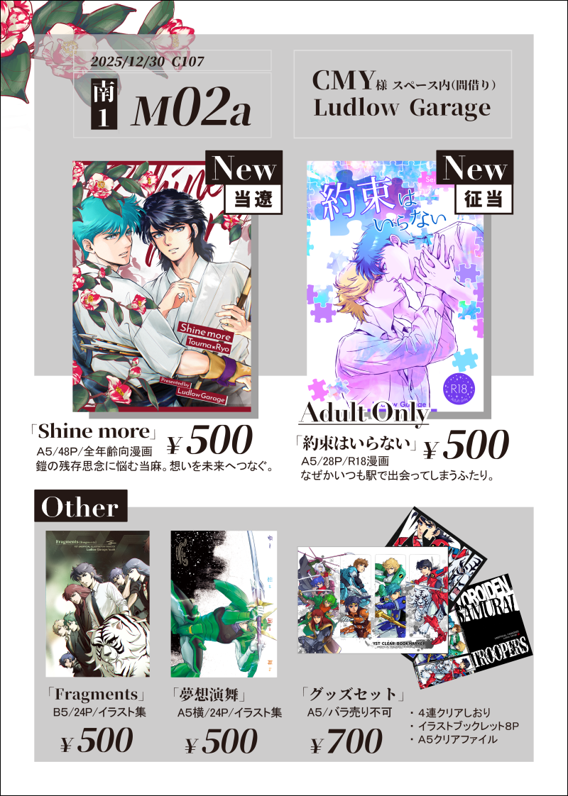年明け通販分は再版し、ラスト手前のシーンに遼のパートを3ページとあとがきを追加して表2-3に装飾を入れた改定本となっています。通販を申し込まれた方へは1月22日に発送済みです。