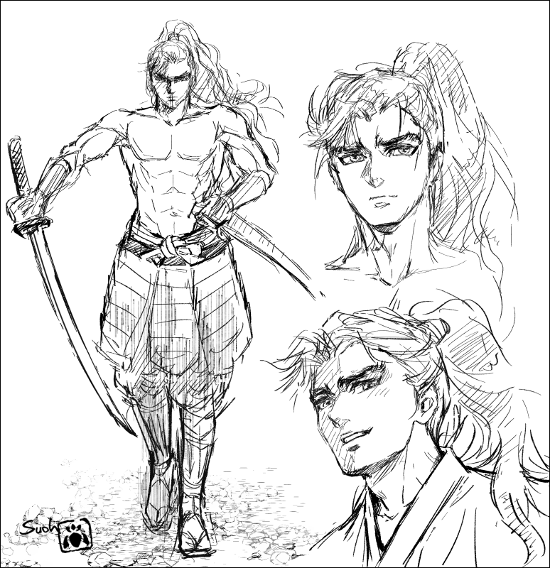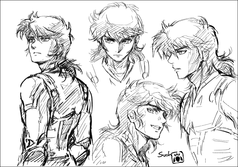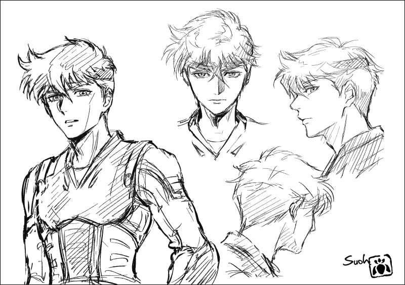 この当遼本のキャラデザ絵です。一枚絵ばかり描いてきたので漫画では絵が安定しなくて苦労しました。これを見ながらでもバラバラですが…道しるべの命綱。後ろの二人は塩山さん風を目指しました。